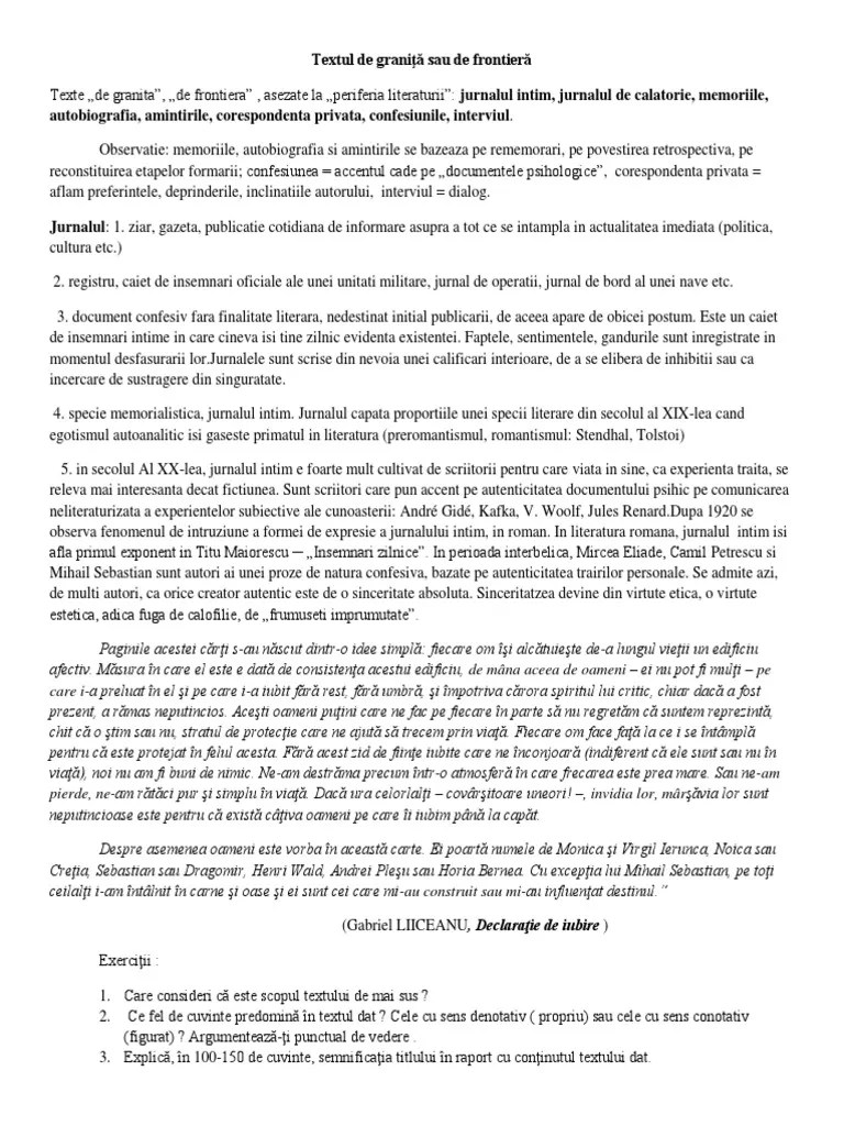 Literatura de frontieră (de graniță): Caracter nonficţional, referent real, creditabil, funcţie informativă şi estetică, mărci stilistice şi subiective, zona de intersecție a științelor limbii și literaturii cu științele, literatura se îmbină cu specii nonartistice cuprinde: 22.01.2016 · texte ficționale, nonficționale, de graniță. Care este definitia textului nonfictional? Trimisă pe 12 mai 2013. Trimisă pe 30 decembrie 2015. Literatura de frontieră (de graniță): 30.01.2018 · el granito es una roca ígnea plutónica compuesta de cuarzo (hasta un 60%), feldespato y mica, minerales principales que se presentan en proporciones diferentes. Trimisă pe 24 ianuarie 2012. Jetzt ausprobieren mit ♥ chefkoch.de ♥. Texte memorialistice, jurnalul, corespondența / textul epistolar, confesiunile, amintirile. Literatura de frontieră (de graniță):