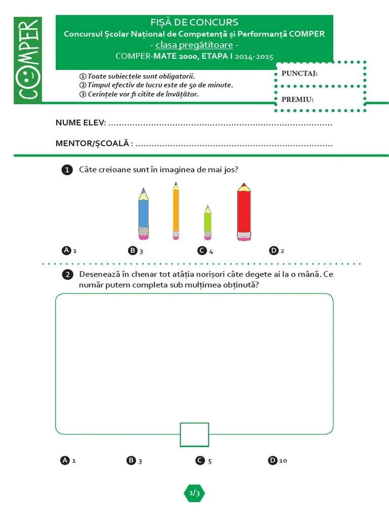 „comper" este un concept educational creat si dezvoltat de fundatia pentru stiinte si arte paralela 45 in anul 2010 de către călin vlasie si este dedicat educatiei nonformale la activitatile. Clasa pregatitoare si clasele 1, 2, 3, 4, 5, 6,7, 8. 11.10.2021 · comper este cel mai cunoscut concurs cu participare gratuita din mediul scolar. Prima pagina | concursurile comper. „comper" este un concept educational creat si dezvoltat de fundatia pentru stiinte si arte paralela 45 in anul 2010 de către călin vlasie si este dedicat educatiei nonformale la activitatile. Aici poti vedea subiectele pentru comper 2020 etapa 1 si rezolvarile corecte Toate subiectele date în anii anteriori reprezintă modele pentru concursul comper 2020! Aveți mai jos subiectele și baremele de corectare date la toate edițiile anterioare. Aici poti vedea subiectele pentru comper 2020 etapa 1 si rezolvarile corecte
