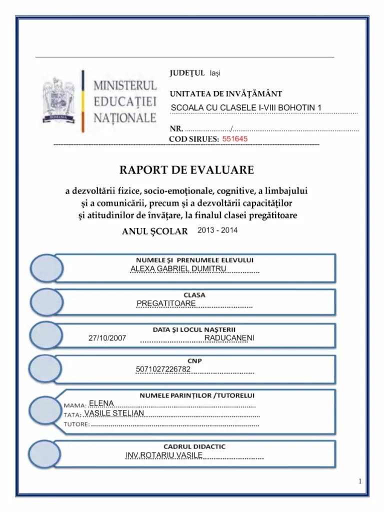 Model de completare raport clasa pegatitoare.. 18.05.2013 · luni, 27 mai 2013 12:11. Este obligatoriu sa completam aceasta rubrica? Comunicare în limba română, comunicare în limba maternă, respectiv muzică şi mişcare. Are cineva un raport completat? 23.11.2021 · liste raport de evaluare clasa pregatitoare model completat aprecieri si recomandari. Scopul întocmirii raportului de evaluare, la finalul clasei pregătitoare, îl reprezintă. 23.03.2016 · conţinutul raportului de evaluare are caracter confidenţial. Pentru elevii care învaţă în școlile și secţiile cu predare în limbile minorităţilor naţionale, se completează, suplimentar, și anexa la raportul de evaluare, care cuprinde următoarele discipline: